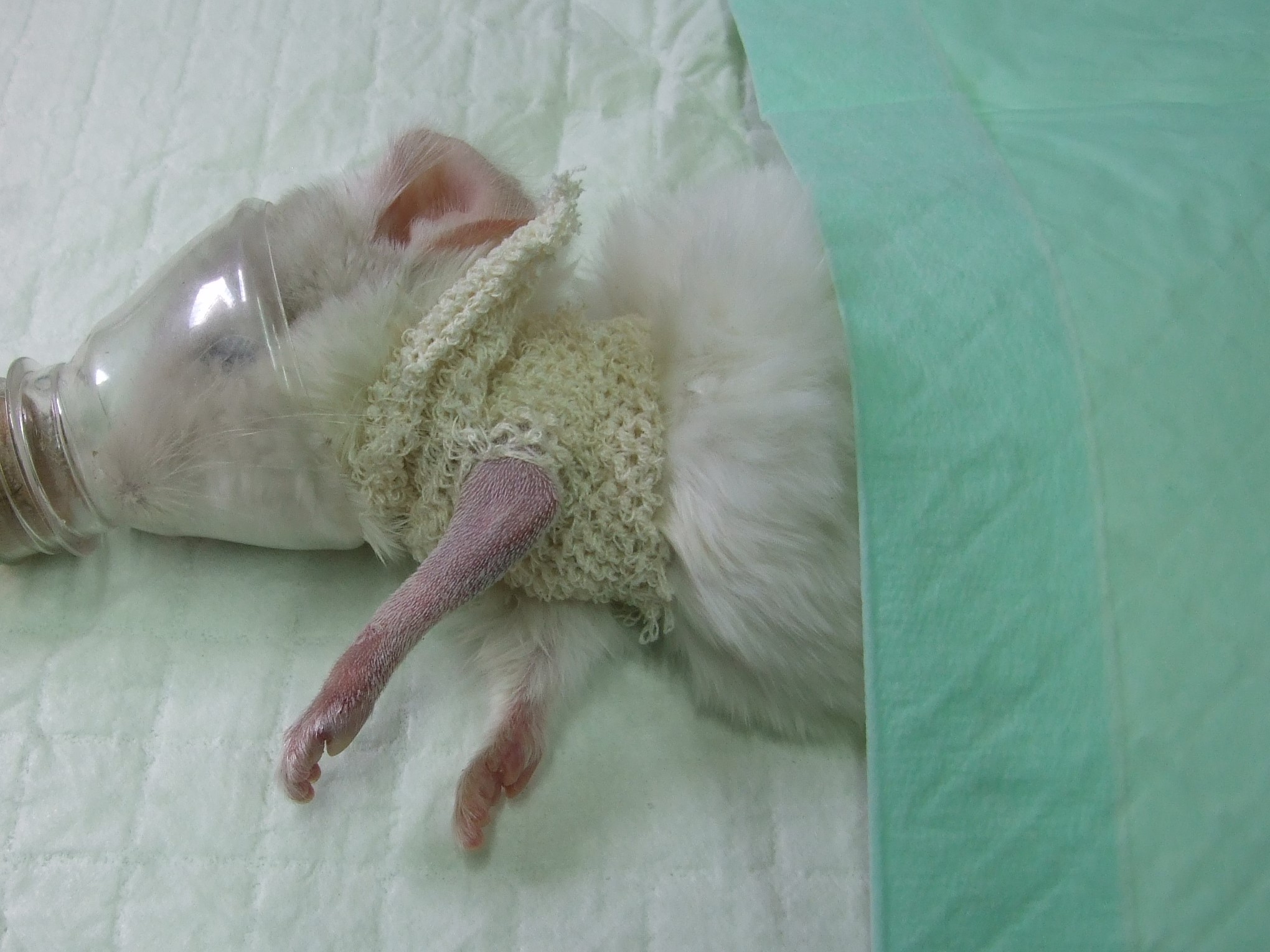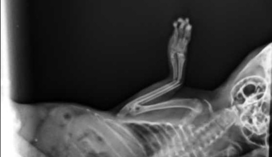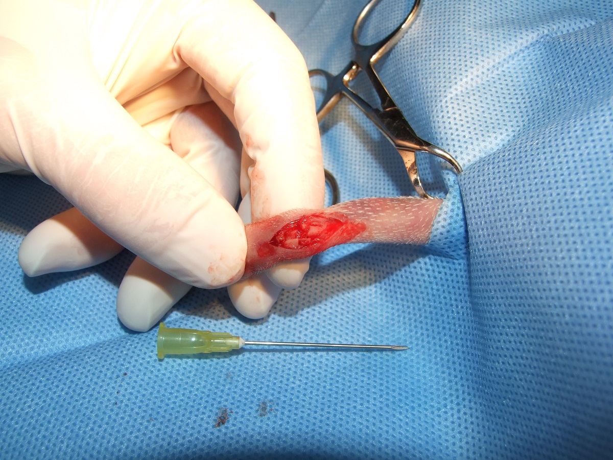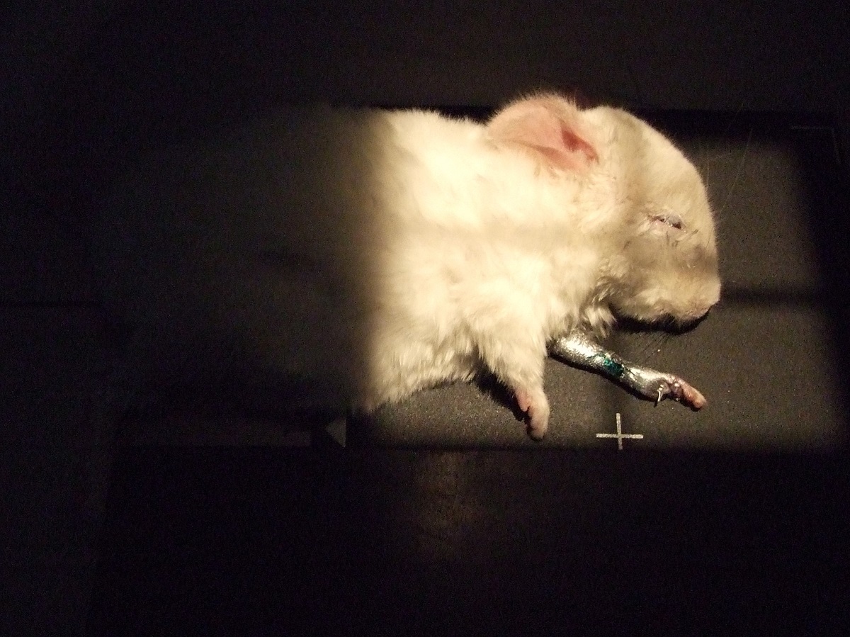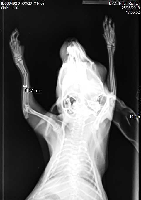 Velmi komplikovaná fraktura obou předloketních kostí u drobné činčily, jelikož se tak drobné implatáty běžně nevyrábějí, řešili jsme ji implantací nitrodřeňových hřebů vyrobených z injekčních jehel. Pacient se kompletně a bez následků uzdravil, po vyjmutí hřebů nožičku naplno používá.