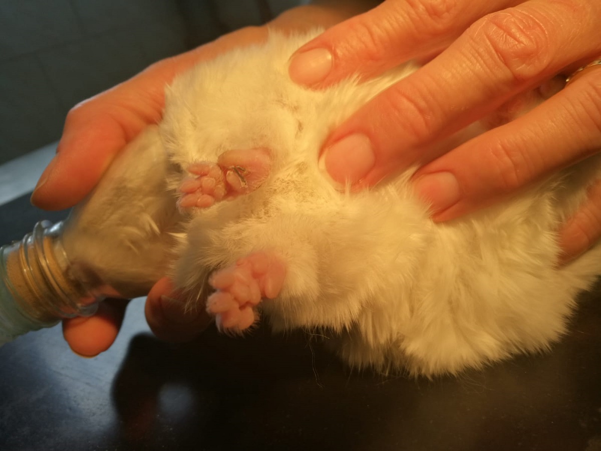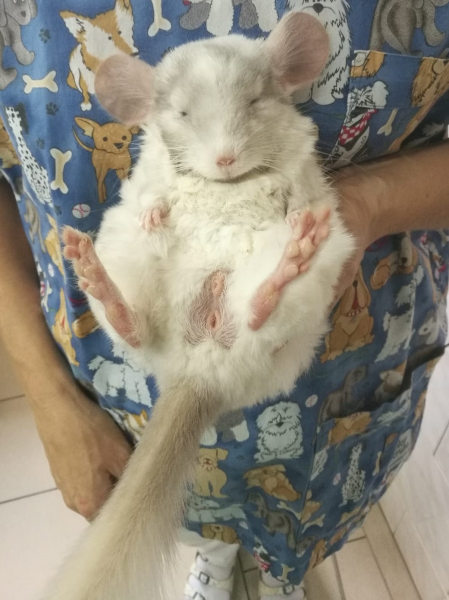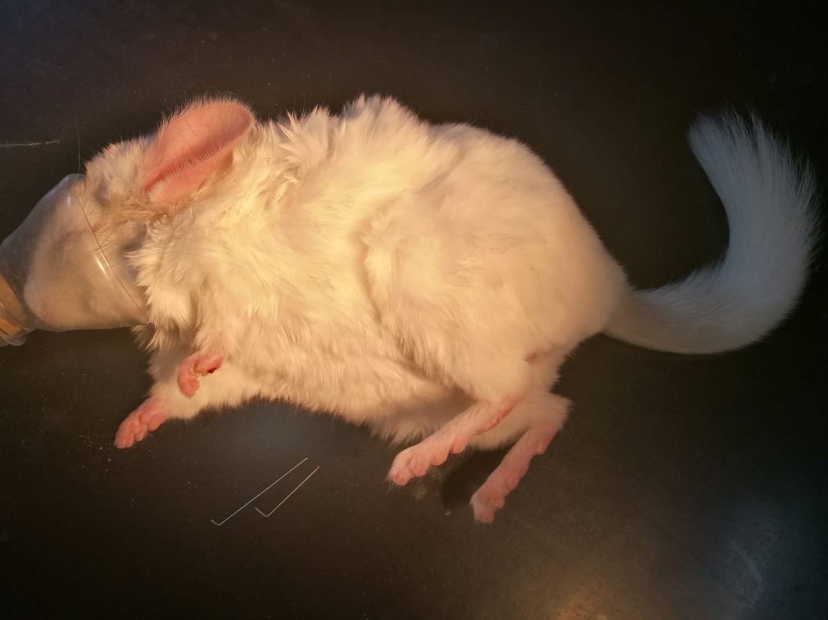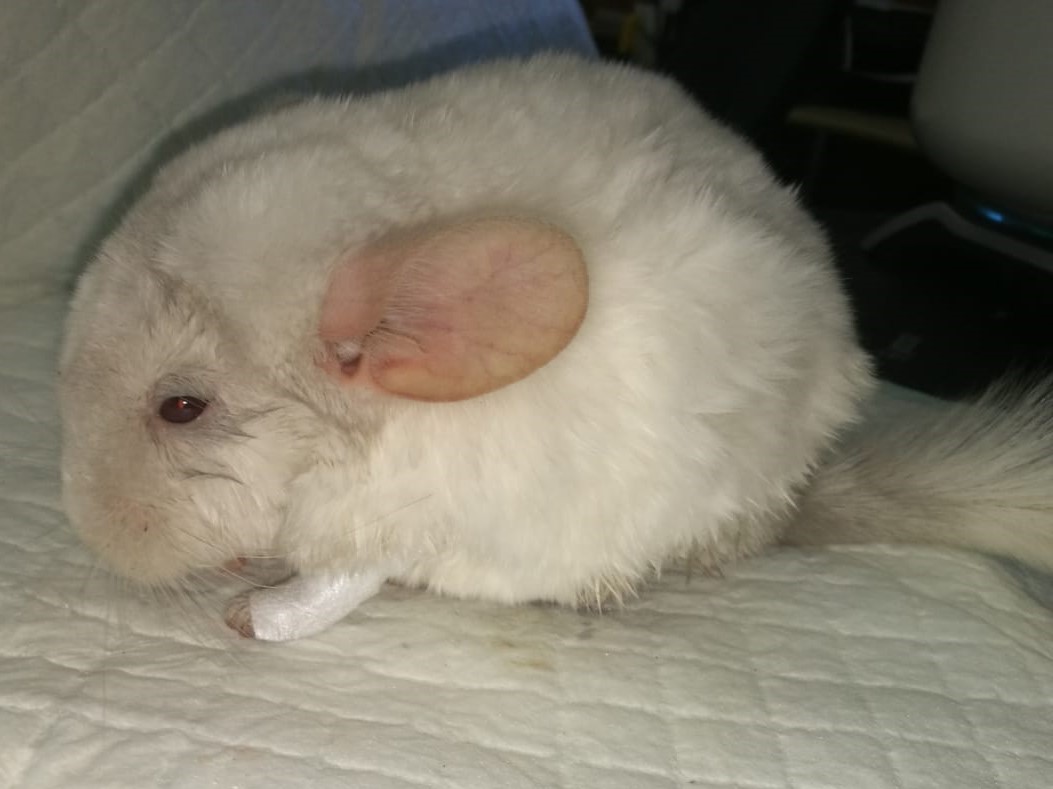 Velmi komplikovaná fraktura obou předloketních kostí u drobné činčily, jelikož se tak drobné implatáty běžně nevyrábějí, řešili jsme ji implantací nitrodřeňových hřebů vyrobených z injekčních jehel. Pacient se kompletně a bez následků uzdravil, po vyjmutí hřebů nožičku naplno používá.