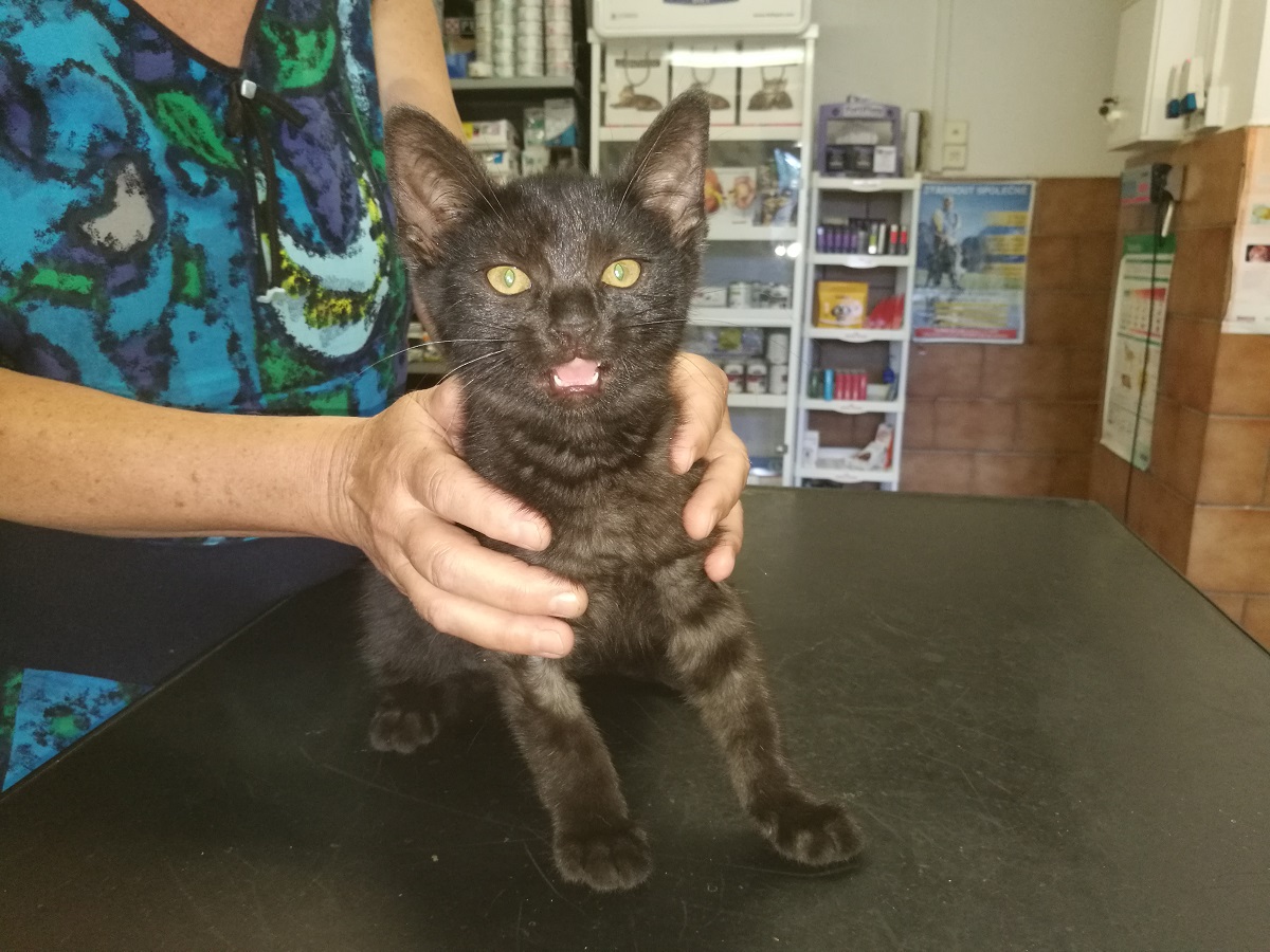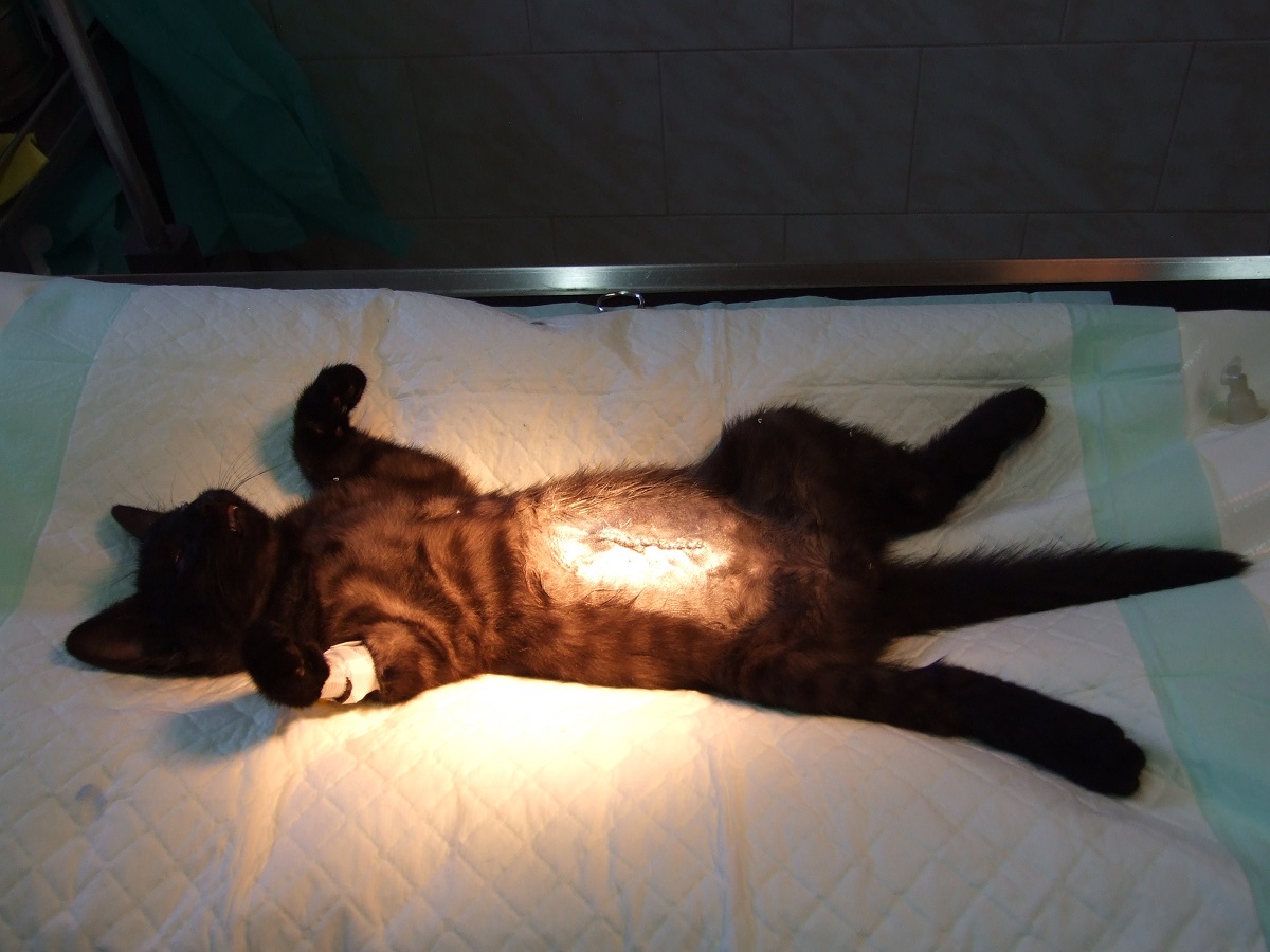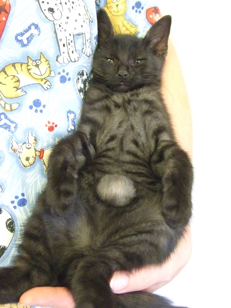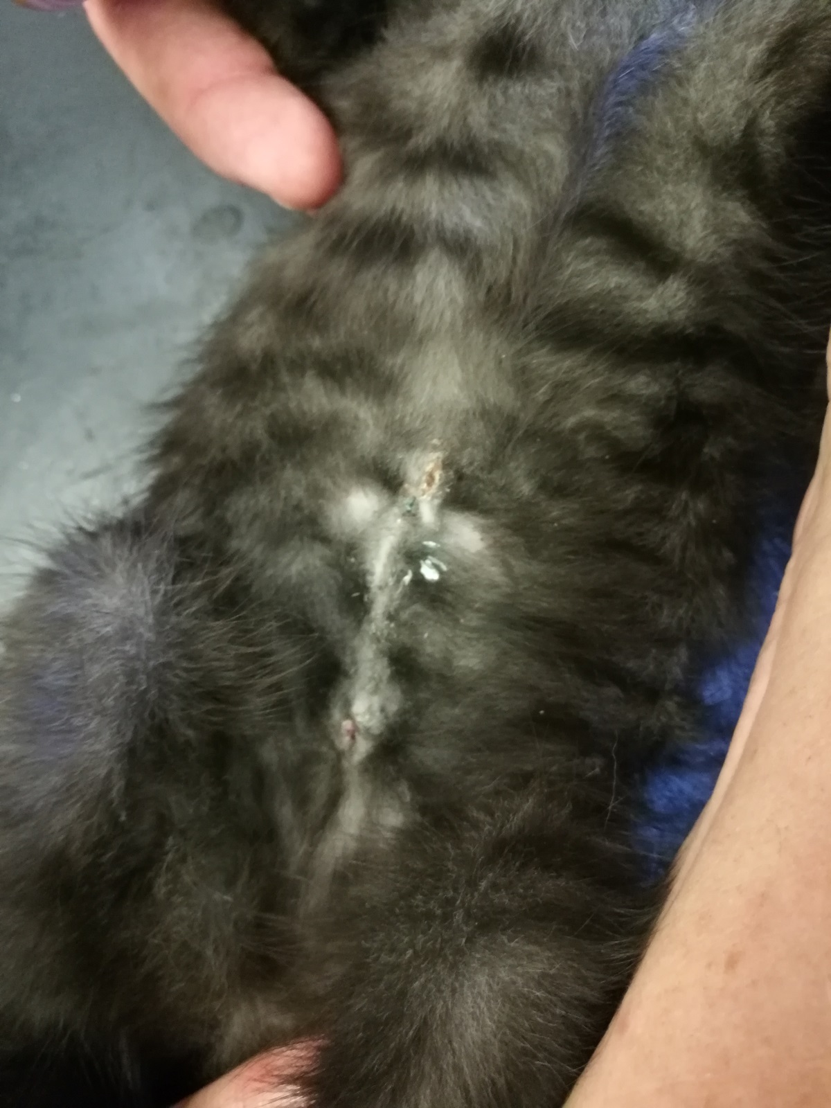 Koťátko s rozsáhlou břišní kýlou s výhřezem střev do podkoží a malformací břišní stěny s výrazně ztenčenou a rozšířenou lineou albou