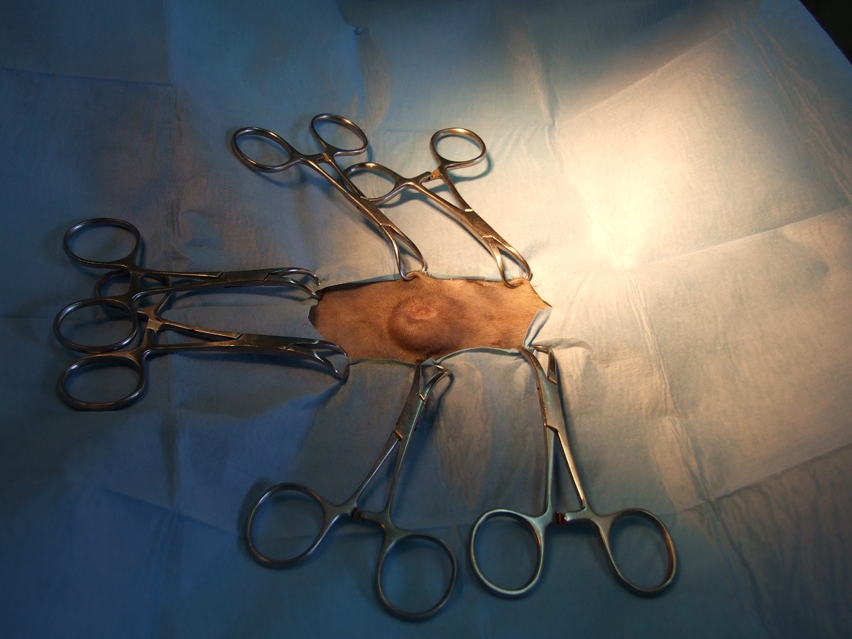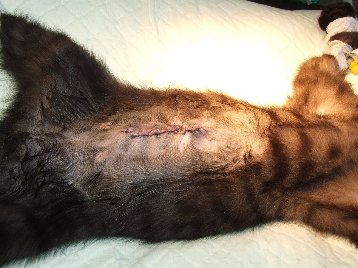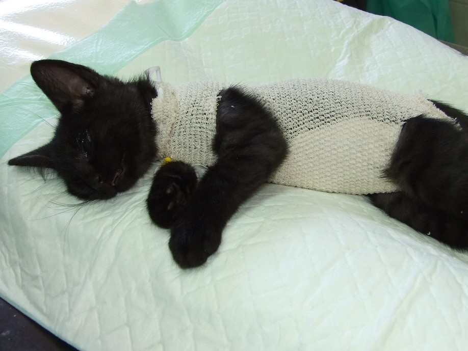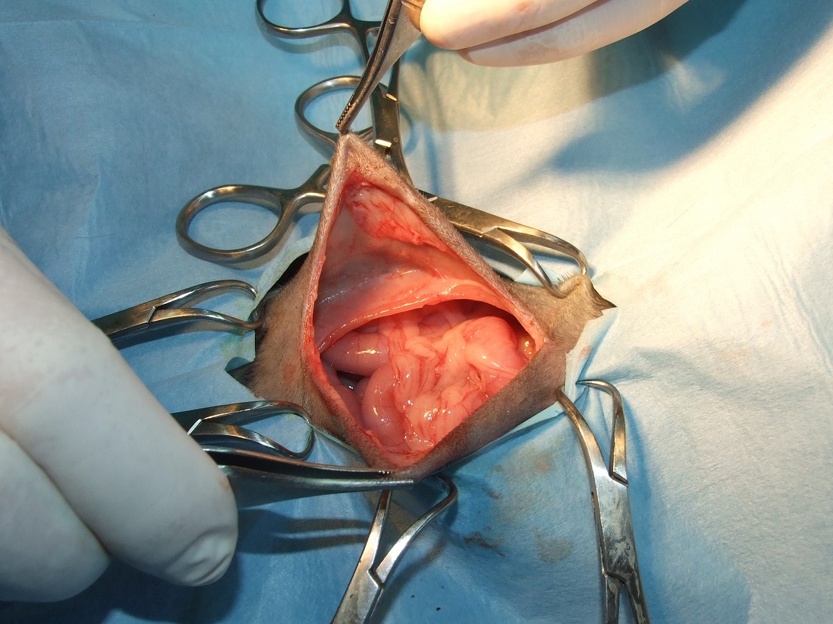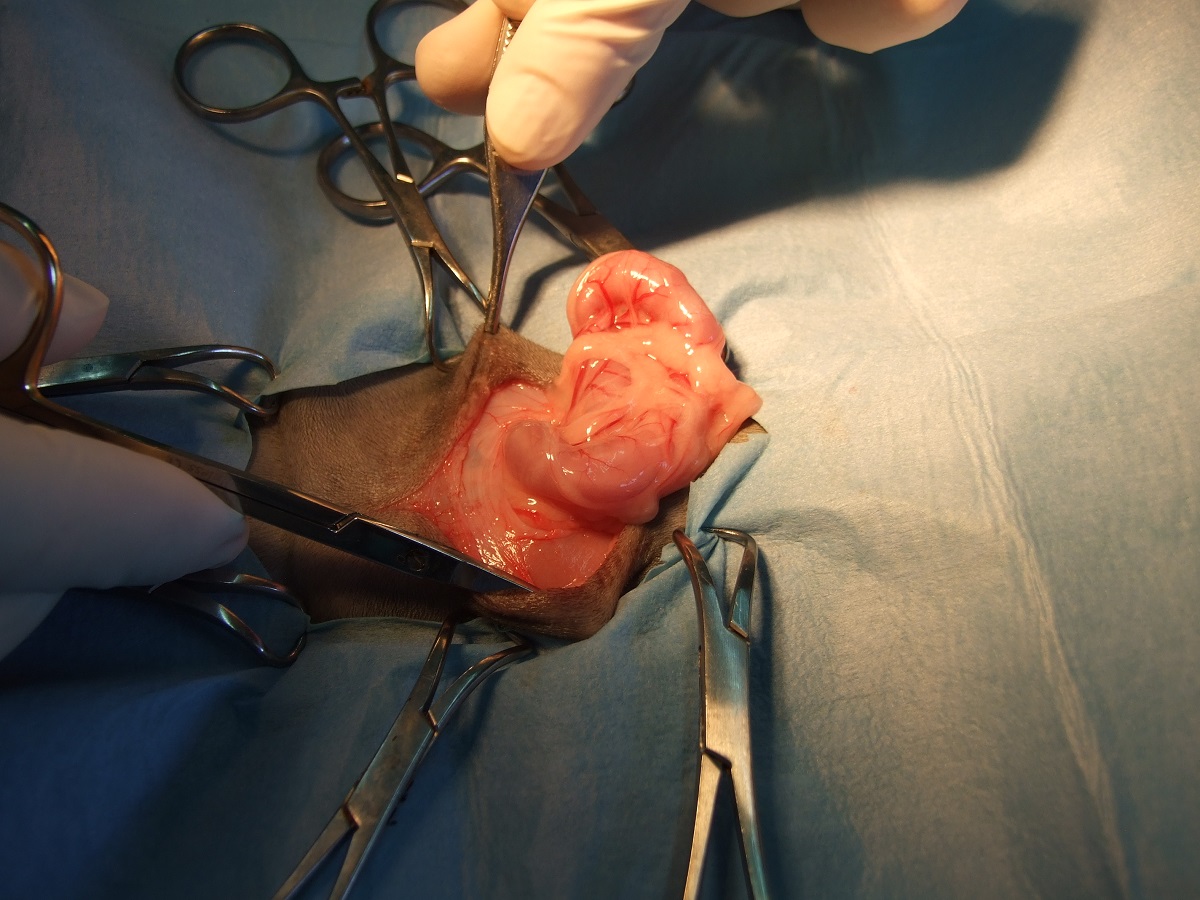 Koťátko s rozsáhlou břišní kýlou s výhřezem střev do podkoží a malformací břišní stěny s výrazně ztenčenou a rozšířenou lineou albou