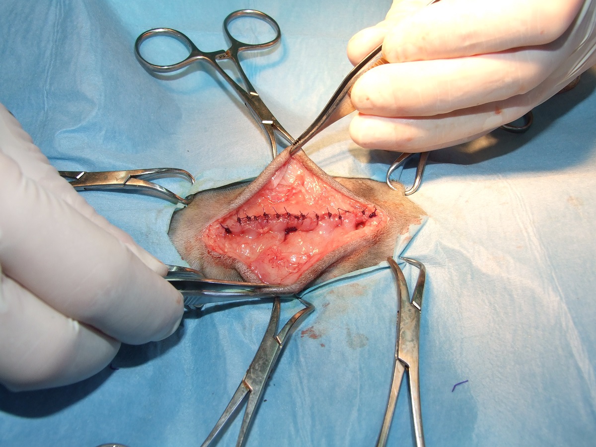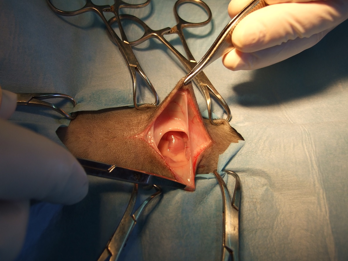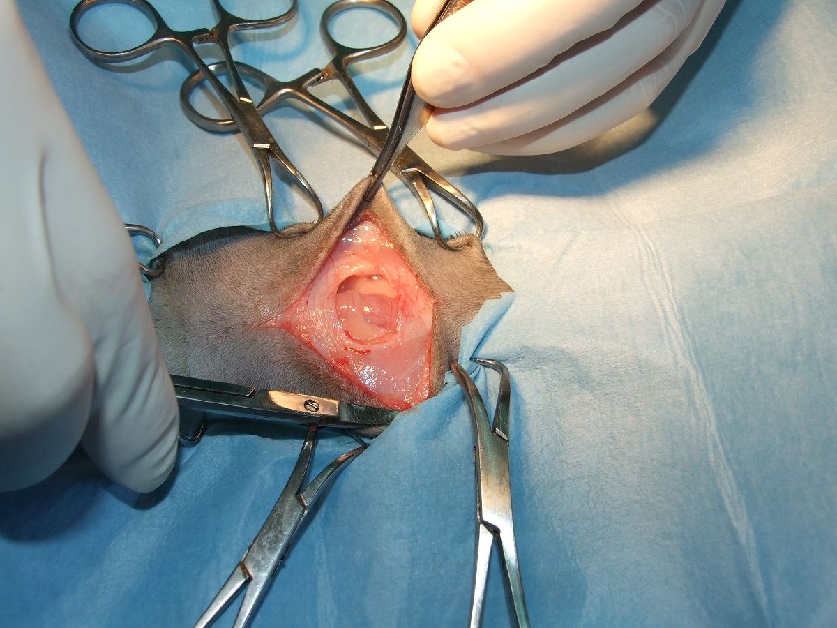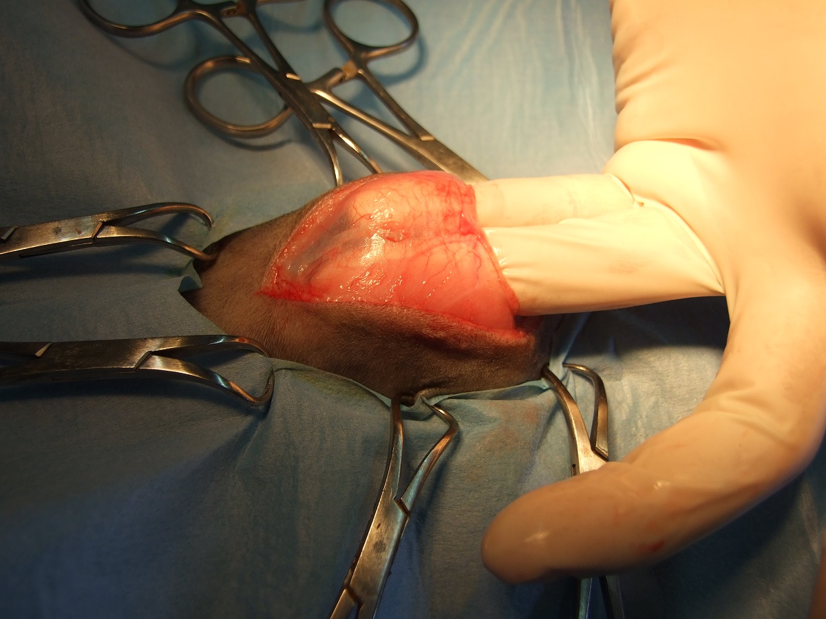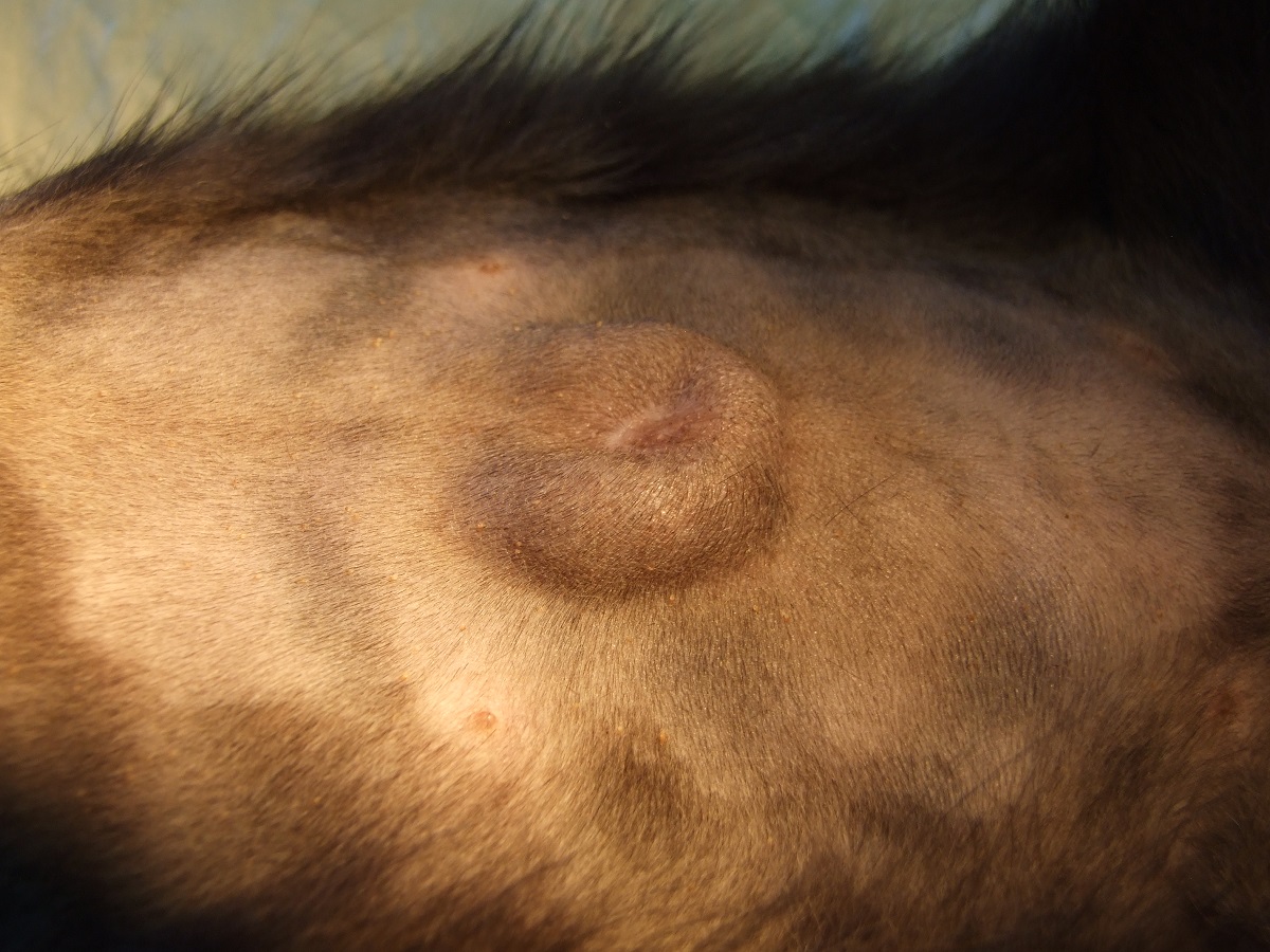 Koťátko s rozsáhlou břišní kýlou s výhřezem střev do podkoží a malformací břišní stěny s výrazně ztenčenou a rozšířenou lineou albou