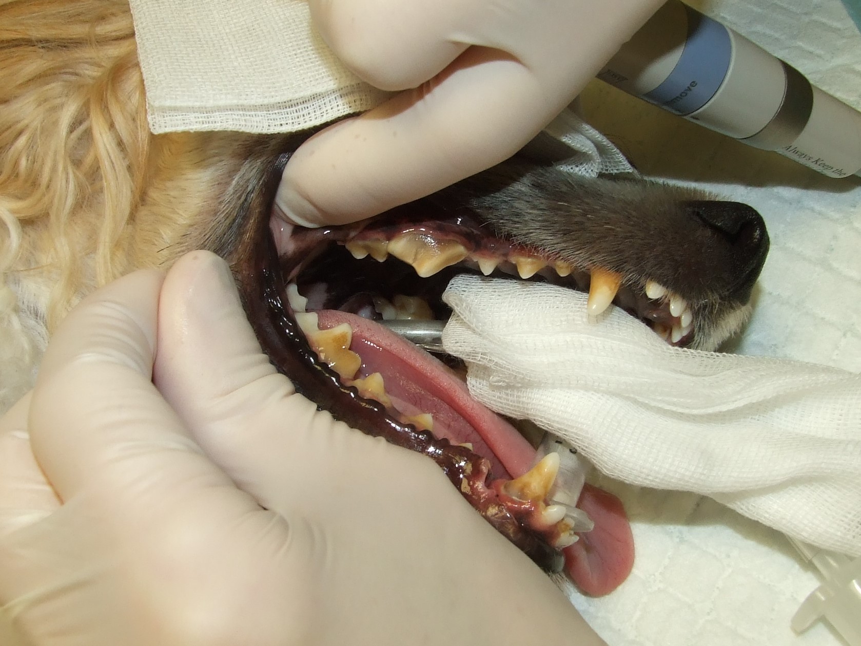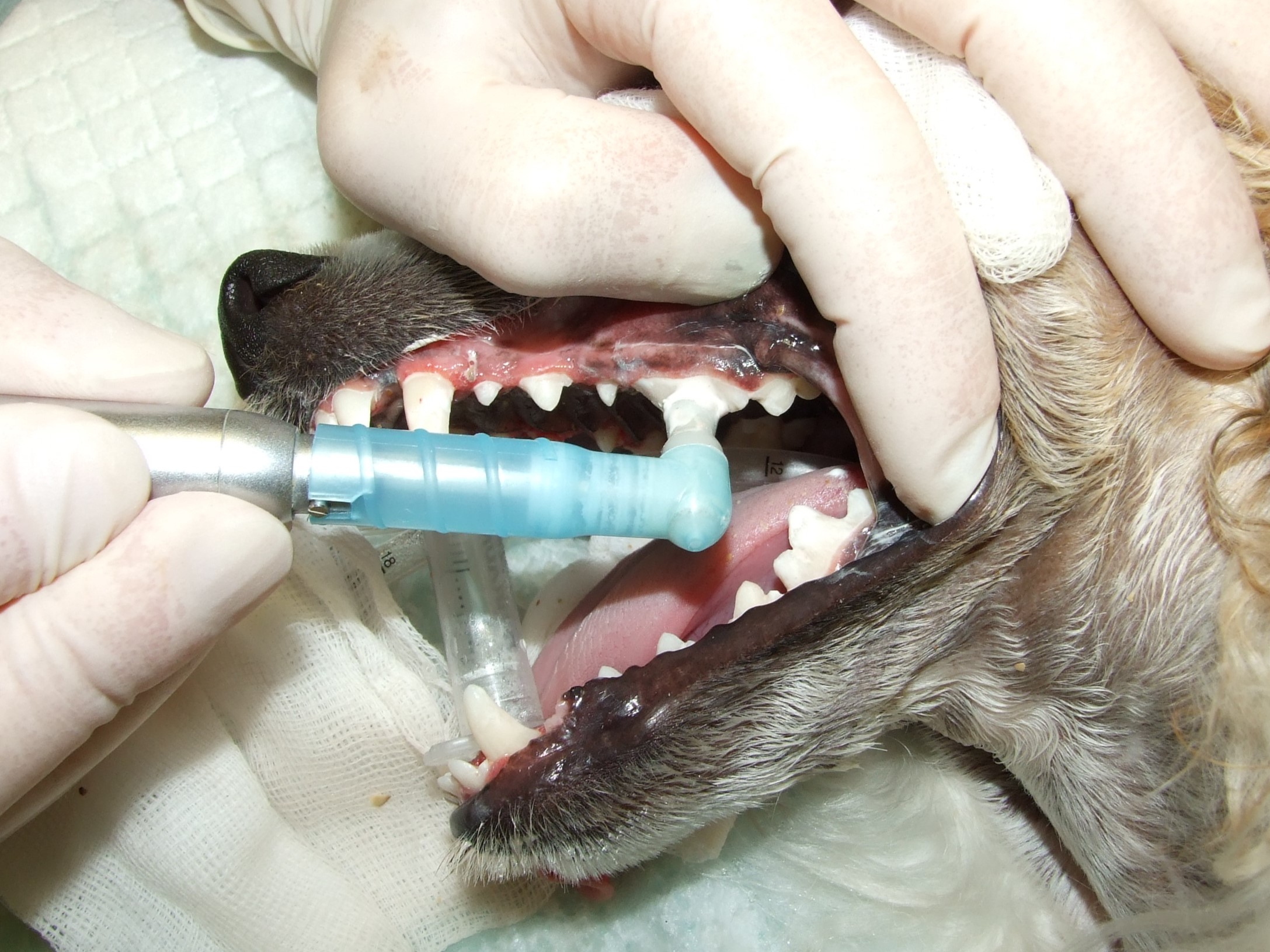 Následný výkon probíhá na stomatologické a zobrazovací vyšetřovně. Pomocí výkoného, ale šetrného ultrazvukového přístroje s led osvětlením koncovky nástroje pro nejlepší vizualizaci pracovního pole odstraníme viditelný zubní kámen, následně vyšetříme každý jednotlivý zub z hlediska stavu parodontu gingivální kalibrovanou sondou a rozhodneme o jeho řešení. K tomu využíváme speciální náhlavní sadu zvětšujícách dioptrických brýlí s led osvětlením, které nám jednak operační pole 1,5 až 8x zvětší, ale také chrání oči stomatologa před aerosolem plným bakterií. Zuby s mírnou parodontitidou po odstranění zubního kamene pouze vyleštíme silikonovým kotoučem na low speed hlavě naší vysokoobrátkové kompresorové stomatologické věže IM3 de luxe. Zuby s parodontózou do 50% závěsu dočistíme v úrovni dásňového chobotu kyretou a vyleštíme. Zuby s paradontózou nad 50%, odhalenou furkací, nebo zuby poškozené opatrně extrahujeme - nestabilní a poškozené zuby jsou zdrojem bolesti a infekce, na takové zuby pacient stejně nekouše a jejich odstraněním se mu obvykle výrazně uleví od diskomfortu a zlepší příjem potravy. Vícekořenové zuby je obvykle potřeba rozbrousit stomatologickou vrtačkou na jednotlivé kořeny a ty pak po uvolnění z dásně opatrně chirurgicky, optimálně bez poškození, vyjmout. Následně celou tlamku vypláchneme dentální sprchou a dezinfikujeme roztokem chlorhexidinu. Po očištění a osušení srsti na hlavě následně s použitím antidota proti sedativní injekci pacienta vzbudíme a zavoláme majiteli, že si pro svého mazlíčka může přijít. Je-li to potřeba, několik dní po výkonu aplikujeme léky proti bolesti. Pacient tak obvykle během 1 až 1,5 hodiny opět odchází zcela vzhůru a orientovaný.