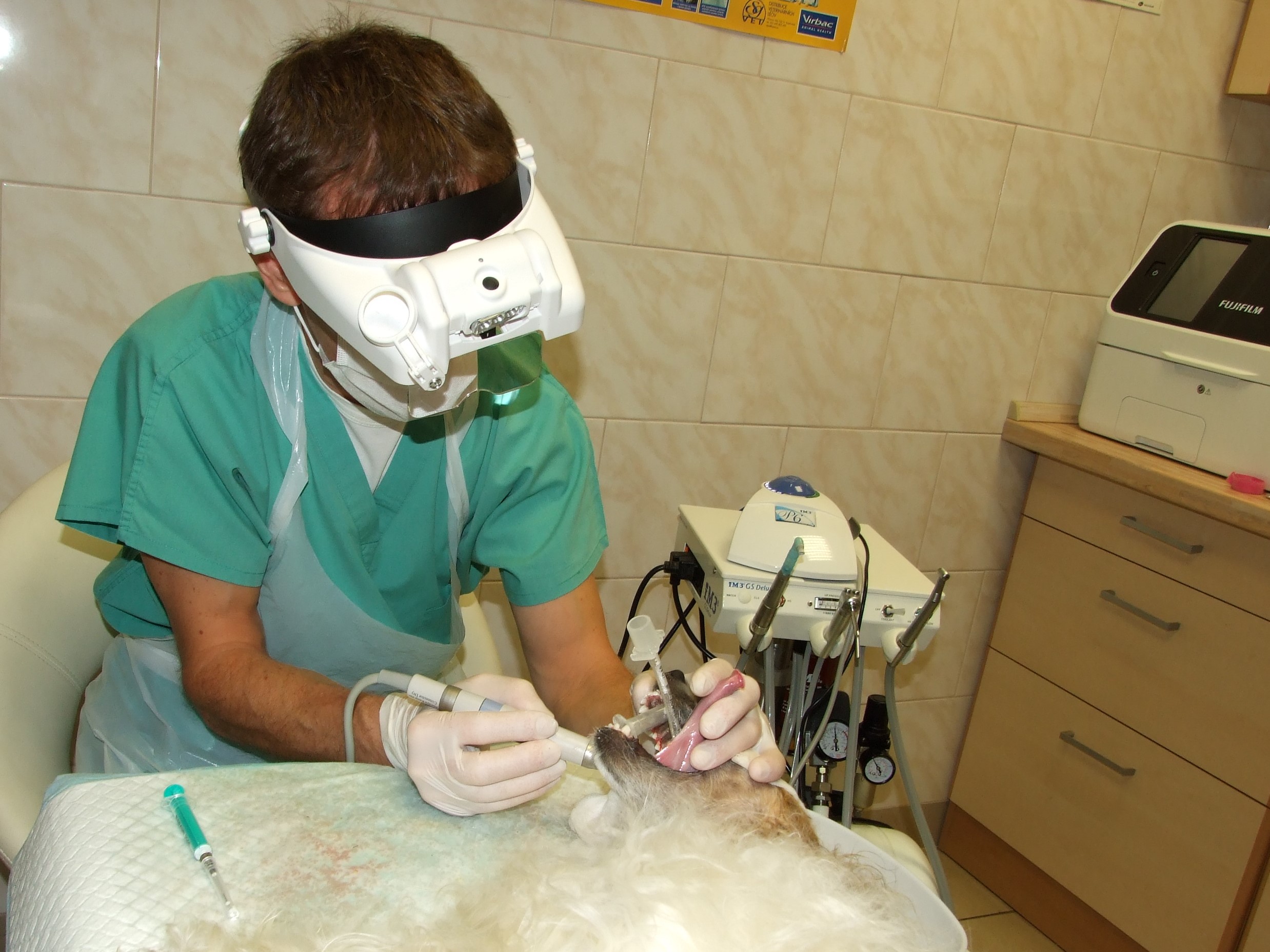 Následný výkon probíhá na stomatologické a zobrazovací vyšetřovně. Pomocí výkoného, ale šetrného ultrazvukového přístroje s led osvětlením koncovky nástroje pro nejlepší vizualizaci pracovního pole odstraníme viditelný zubní kámen, následně vyšetříme každý jednotlivý zub z hlediska stavu parodontu gingivální kalibrovanou sondou a rozhodneme o jeho řešení. K tomu využíváme speciální náhlavní sadu zvětšujícách dioptrických brýlí s led osvětlením, které nám jednak operační pole 1,5 až 8x zvětší, ale také chrání oči stomatologa před aerosolem plným bakterií. Zuby s mírnou parodontitidou po odstranění zubního kamene pouze vyleštíme silikonovým kotoučem na low speed hlavě naší vysokoobrátkové kompresorové stomatologické věže IM3 de luxe. Zuby s parodontózou do 50% závěsu dočistíme v úrovni dásňového chobotu kyretou a vyleštíme. Zuby s paradontózou nad 50%, odhalenou furkací, nebo zuby poškozené opatrně extrahujeme - nestabilní a poškozené zuby jsou zdrojem bolesti a infekce, na takové zuby pacient stejně nekouše a jejich odstraněním se mu obvykle výrazně uleví od diskomfortu a zlepší příjem potravy. Vícekořenové zuby je obvykle potřeba rozbrousit stomatologickou vrtačkou na jednotlivé kořeny a ty pak po uvolnění z dásně opatrně chirurgicky, optimálně bez poškození, vyjmout. Následně celou tlamku vypláchneme dentální sprchou a dezinfikujeme roztokem chlorhexidinu. Po očištění a osušení srsti na hlavě následně s použitím antidota proti sedativní injekci pacienta vzbudíme a zavoláme majiteli, že si pro svého mazlíčka může přijít. Je-li to potřeba, několik dní po výkonu aplikujeme léky proti bolesti. Pacient tak obvykle během 1 až 1,5 hodiny opět odchází zcela vzhůru a orientovaný.